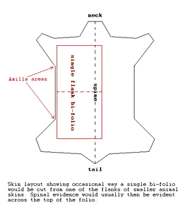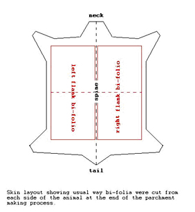 The manuscript is made up from gatherings of parchment sheets called quires. These quires consist of 4 bi-folios[23] or 8 leaves and in its original state the Codex probably contained at least 730 leaves or 365 bi-folia. Quires would be arranged with the flesh side of the parchment outermost then alternating with the matching sides facing each other throughout the quire. The current folio dimensions of the bifolium are roughly 380mm (height) x 680mm (width) but from the evidence of trimming[24] the original open bi-folium could have been at least circa 400 x 700 mm (16 x 28in). Lack of skeletal evidence suggests that the folios were cut from the flanks of large skins which would need to have been about eight square feet in area. (See figs. 1 & 2. below) Even with stretching on a herse, the size of the bi-folios would suggest that the parchment is not uterine[25] and would contest the idea that the fineness and thinness of the parchment is a result of this. If two bi-folia could be cut from either side of a sheep or calf skin, calculations suggest that almost 200 near perfect skins would be required for this manuscript, displaying a humbling level of manufacturing skill so early in the use of parchment.