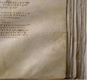 In the case of Codex Sinaiticus, the quality of the parchment is fine and the folios have an amazing uniformity of thinness ranging between 0.1 and 0.2 mm. In the absence of comparative codices it is hard to say whether this is exceptional but if one considers the skill level required it is no less than remarkable. Had the animal origin been solely wool sheep, the thinness might have easily been attributed to skin splitting. However, the predominance of calf skin seems to rule this out unless the ancient parchment makers had perfected a method of splitting calf skin. Reed suggests that large, strong sheets could be produced from the grain splits of cattle hides that give a more even character over greater areas, but his comments are based on modern methods.[31] Reed also describes a number of different parchment maker’s recipes[32] so it is not unreasonable to think ancient parchment makers used ingredients in the lime baths or on the skins during the making process which helped to achieve the thinness. Special baths may have treated the skin in a way that enabled it to be scraped in a far more controlled manner or perhaps the skin was coated with an acid-like paste which removed layers of skin and fat, not unlike modern-day exfoliation. Until further analysis can determine some answers, these suggestions remain speculative.