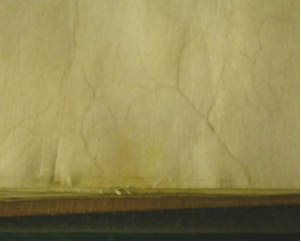 This refers to visual evidence of the vessels through which blood flowed in the skin layer (see fig. 7). At the time of slaughter, even though the skin has ceased to be living tissue, blood will remain in the vessels unless it is drained out. Proper drainage of the blood vessels is essential, otherwise the iron compounds of the blood will react with the lime liquors to form dark coloured pigments which are extremely difficult, if not impossible, to remove.[28] Well drained animal skin can make veining evidence almost invisible and often only detectable as translucent areas when back lit. None of the veining evidence recorded in the assessment showed discolouration and is consistent with the idea that the quality of the parchment is high.