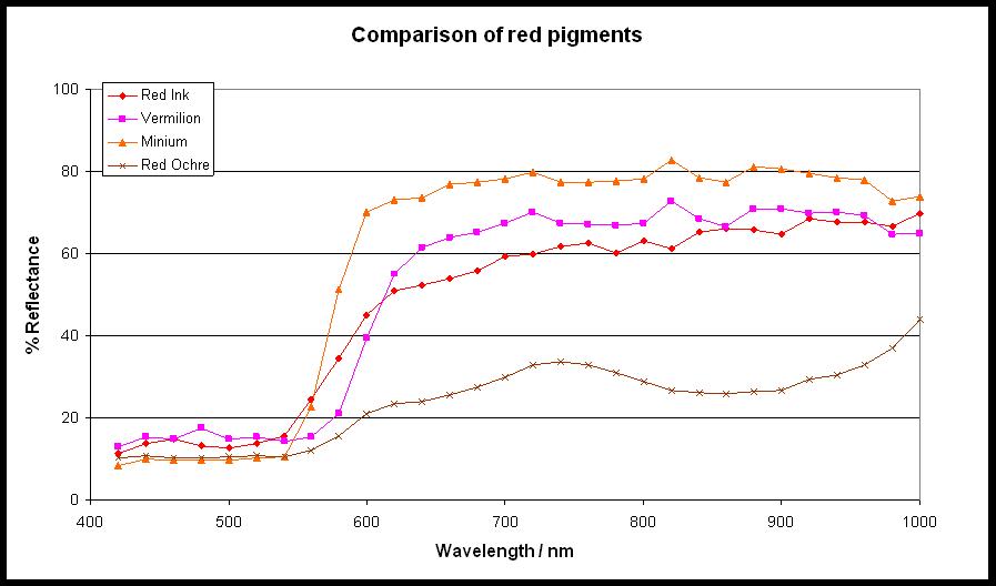 Similarly, comparison of the reflectance spectrum of the red ink with those of possible red pigments shows that red ochre can be ruled out (Fig. 4). The spectrum is more similar to that of vermilion (mercuric sulphide, HgS) than that of minium (red lead, Pb3O4), but again the identification is not conclusive [5]. The colour of the ink is more similar to vermilion (dark red) than minium (more orange), but the appearance will be affected by the particle size and the thickness of the ink.